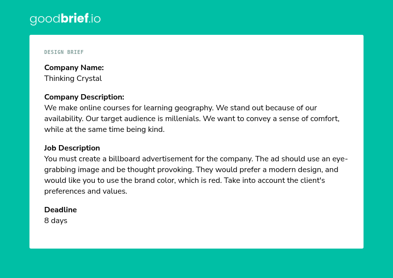 For this, I used a site called Goodbrief to generate a brief to work from. This took a few tries before one that was both interesting and made sense was found.
