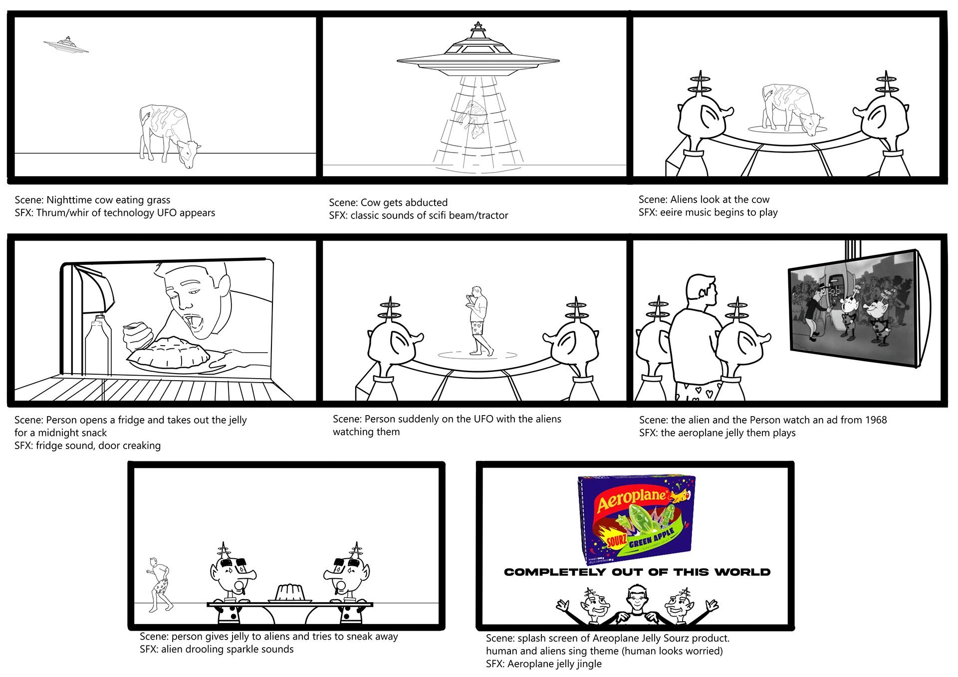 While the old ad was animated, I imagine this one being live action, making use of improved CGI for the aliens. The main goal of the new ad is to keep the same humour as the original. Also, the product was changed from the old original jelly to the new Sourz, as the Sourz packaging makes more sense with the alien theme of the ad.