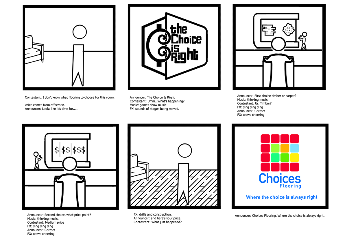 The goal of this brief was to create a storyboard for a 15-30 second ad showing that choosing with Choices Flooring is the right choice.